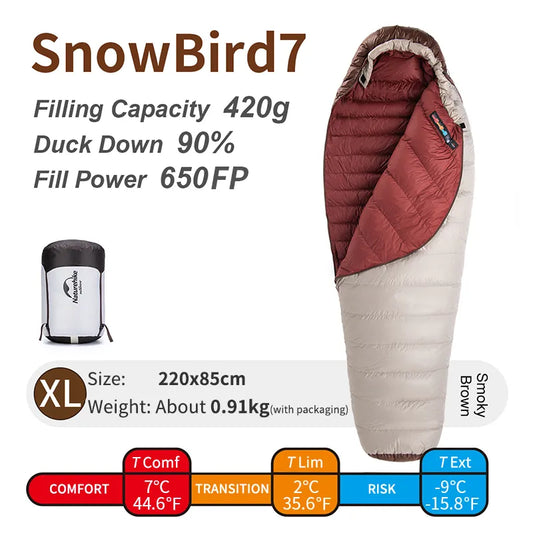Naturehike Snowbird 7 2 Down Sleeping Bag - Ultralight, 4 Season, Mummy Style, -3 -7°C